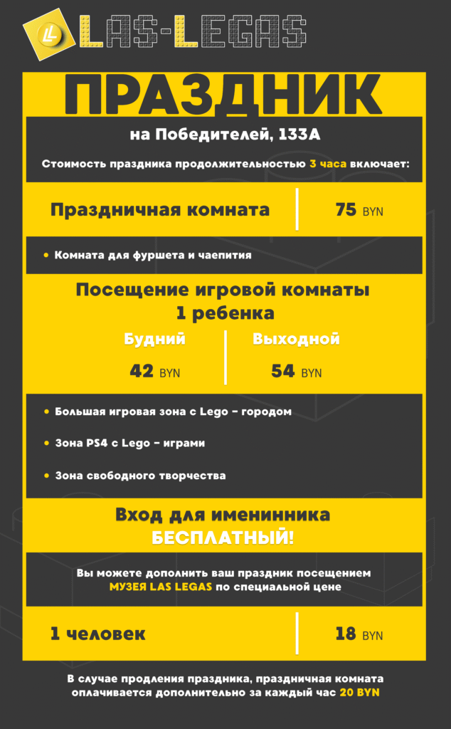 На базе данной игровой комнаты и Lego-музея проводятся детские дни рождения и другие праздники.
