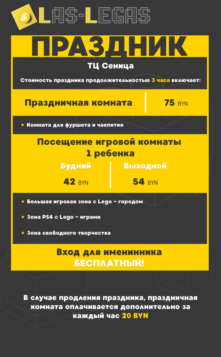 Это настоящий Lego-рай: огромный город из Лего в который можно играть; зоны свободного творчества, зона Duplo для самых маленьких; консольная зона с 4 приставками PS4 и самыми лучшими видео-играми Lego.